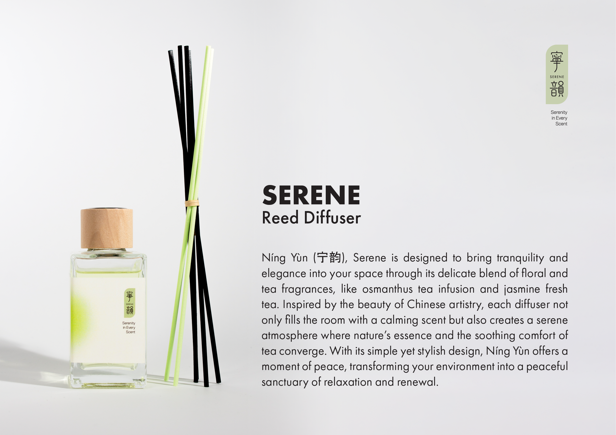 Níng Yùn (宁韵) is designed to bring tranquillity and elegance into your space through its delicate blend of floral and tea fragrances, like osmanthus tea infusion and jasmine fresh tea. Inspired by the beauty of Chinese artistry, each diffuser not only fills the room with a calming scent but also creates a serene atmosphere where nature’s essence and the soothing comfort of tea converge. With its simple yet stylish design, Níng Yùn offers a moment of peace, transforming your environment into a peaceful sanctuary of relaxation and renewal.